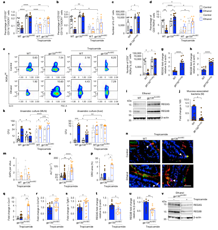 激活肠道上皮细胞的IL6ST信号,可以逆转酒精对mAChR4的抑制,恢复GAPs的形成和下游的免疫保护作用。肠道特异性激活IL6ST(gp130Act/IEC)的小鼠在酒精暴露下,仍能维持高水平的mAChR4表达、GAPs数量、IL-22及REG3蛋白,从而显著减少细菌向肝脏易位,并产生强大的ALD抵抗力。